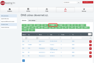 Nad seznamem DNS záznamů zvolte tlačítko CNAME.